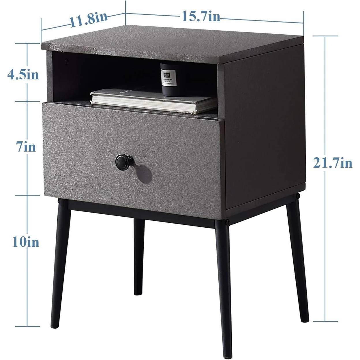 The Mid Century Modern End Table Nightstand in Grey Black Wood Finish is constructed of high-quality MDF PVC brushed brown board finished with black fine matte, which is thick and durable enough to strongly support the end itself and stuff inside or on it. The open shelf gives sufficient storage room for storing and displaying. One drawer with a handle offers ample room for storing private or other stuff you want to put inside. Featuring a lightweight and compact design, the nightstand can be easily and conveniently moved to any place in your bedroom or living room. Ideal for beside beds, nightstands, recliner side table, bedside table, reading, writing, drawing or anything else that you could possibly think of. It was very easy to assemble! Your relaxing weekend afternoon shouldnít be bothered by the nuts and bolts. We get it. So this side table comes with numbered parts and clear instructions to help you finish the assembly easily. Before installing this nightstand, please check whether the accessories in the package are complete. If some accessories are missing, please contact us first. An accessory kit will be sent for free.