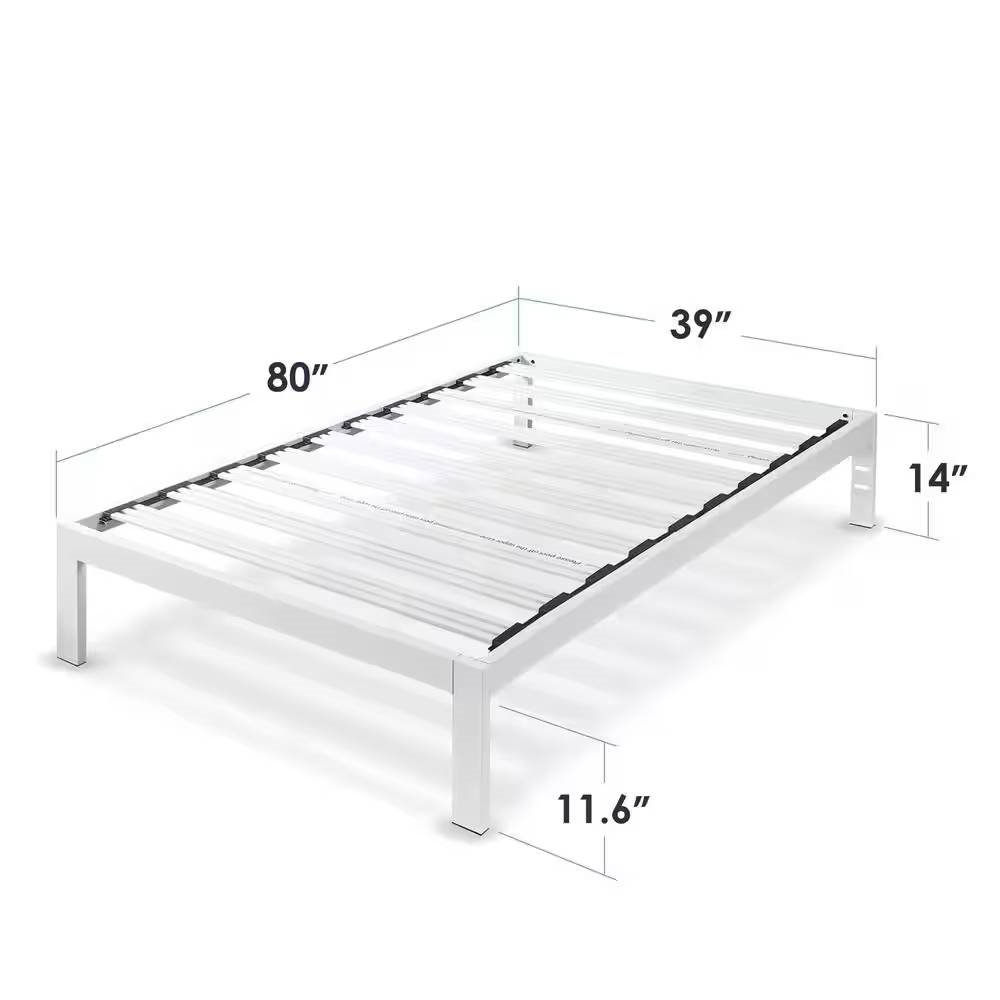 This Twin XL size Wide-Slat White Metal Platform Bed Frame with Headboard Brackets is constructed with 100% steel and heavy duty steel slats to support both you and your mattress. The patented extra wide steel slats provide superior stability, no box spring needed. For those who often stub their toes, the middle leg at the side of the bed was removed for your comfort. Its clean, simple edges create a modern design available in both white and black, perfect for minimalists. To save you as much space as possible, we included 11 in. under-bed clearance for storing your odd bits and ends. What's more, this bed requires no additional tools, will be easily assembled within minutes. Product Dimensions: Twin: 75 in. x 39 in. x 14 in., Twin XL: 80 in. x 39 in. x 14 in., Full: 75 in. x 54 in. x 14 in., Queen: 80 in. x 60 in. x 14 in., King: 80 in. x 76 in. x 14 in., California King: 84 in. x 72 in. x 14 in.