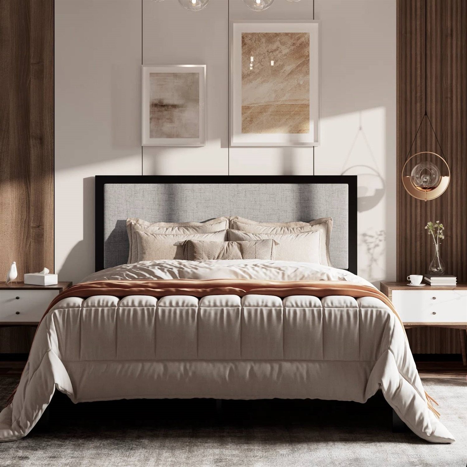 This King Black Metal Platform Bed Frame with Tall Grey Linen Upholstered Headboard grounds your bedroom in a modern aesthetic. It's crafted from solid and engineered wood with a black finish and a streamlined, simple silhouette. The headboard has a built-in linen blend upholstery panel in a coordinating light gray hue. It's stuffed with foam, giving you a cushion as you curl up with a book. We love how the neutral hue easily works with numerous color schemes and patterns. This bed has center legs that provide additional support. Best of all, a box spring is not necessary. It has a weight capacity of 800 lbs.