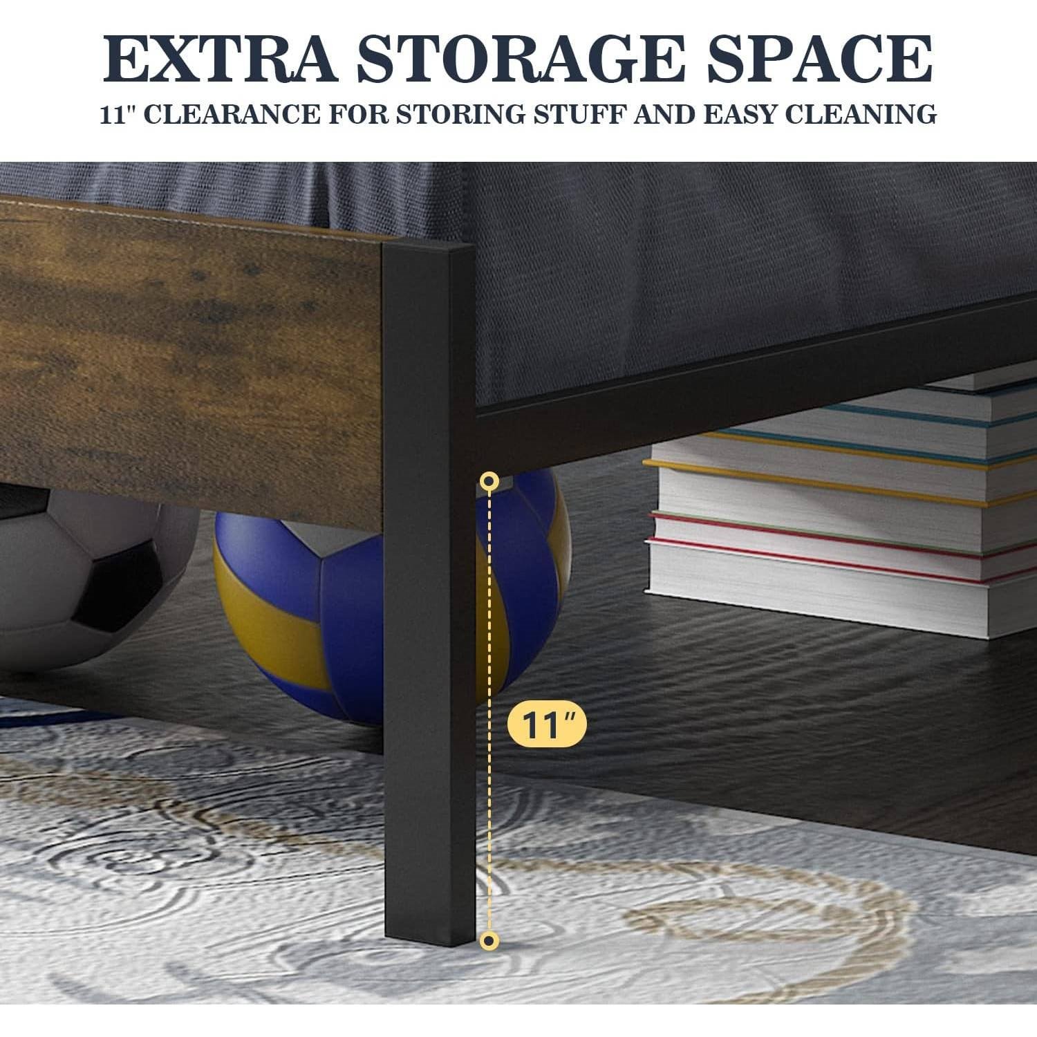 This Twin Modern Metal Platform Bed Frame with Rustic Wood Headboard and Footboard is with beautiful headboard & footboard, Rustic Country, Antique or Retro industrial, suitable for any bedroom style decoration. 11î clearance, with plenty of under bed space for storage. Specially thickened metal beams in the middle and both sides of the bed; 12 steel support slats and multiple sturdy middle support feet; stable & durable enough to provide good sleep. Fixed buckle and EVA noise-free tape on beams are added, to reduce shaking and friction between metals, and types of efforts to minimize noise. All tools, parts, and instructions are included for stress-free assembly that takes less than one hour, or easily disassemble for moving. Our platform beds are expertly engineered to be simple and easy to enjoy every single day.