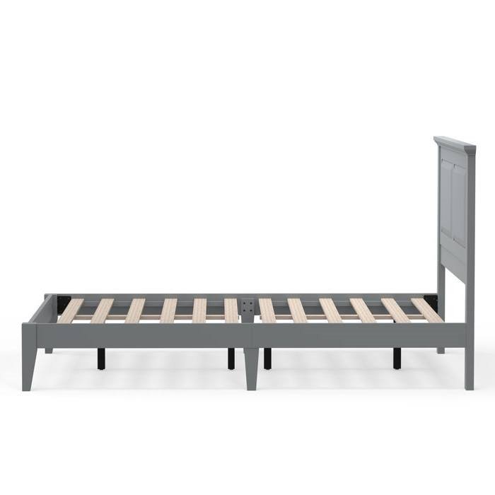 This Full Size Retro Solid Oak Wooden Platform Bed in Grey with prominent headboard is a must have for any bedroom! Inset panels and retro molding that adds refined elegance to any bedroom or guest room. It is crafted from solid oak, a naturally hard and durable wood. Platform bed sits on straight and slightly tapered legs that raise this bed almost 8 inches off the floor. This system of slats eliminates the need for a box spring and works best with any standard mattress (recommended 10 inches of thickness). Assembly is required.